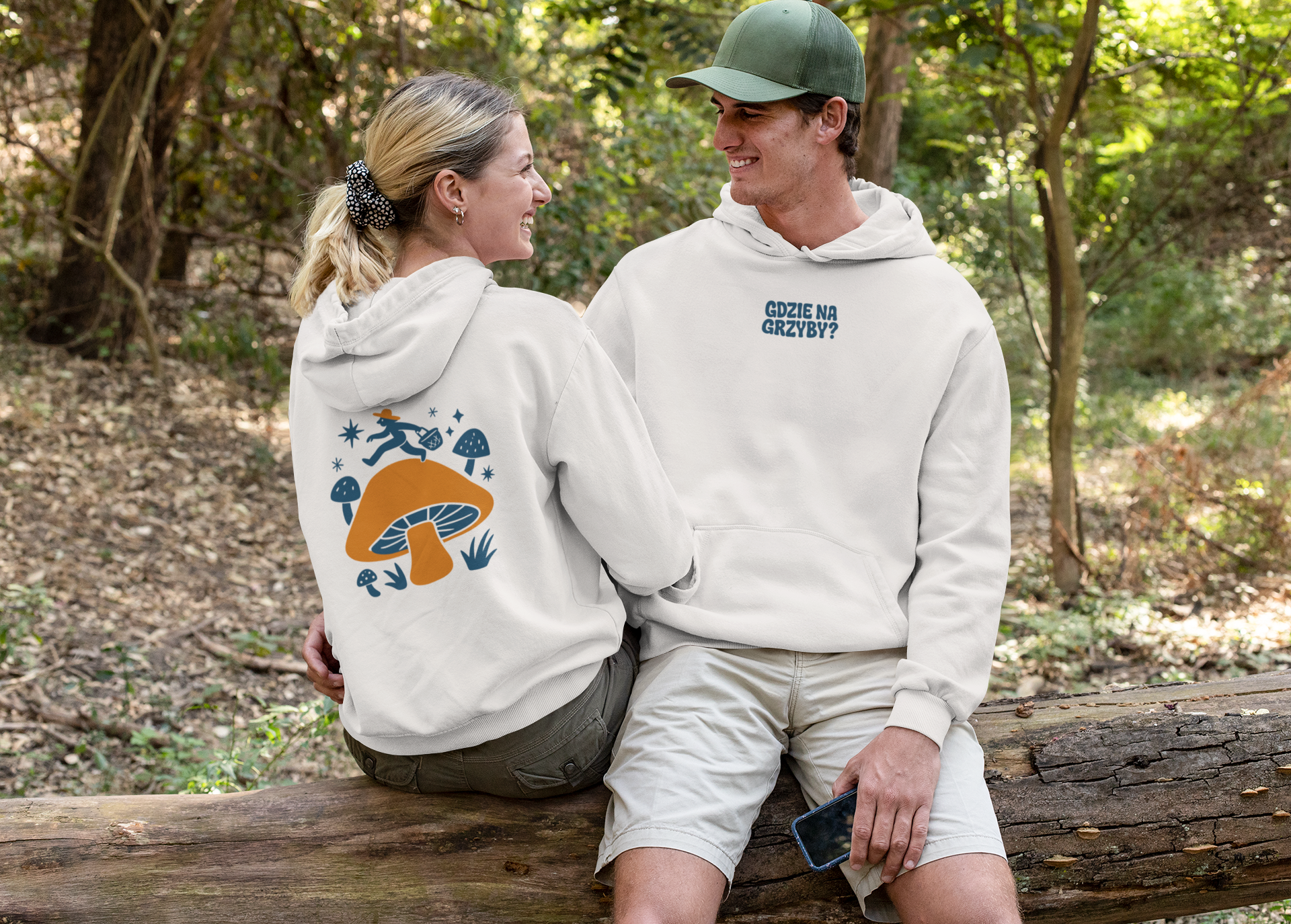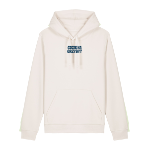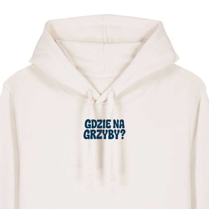 Ta bluza z kapturem Vintage White to idealny wybór dla wszystkich, którzy kochają las, grzybobranie i mają dystans do siebie. Na przodzie, na klatce piersiowej, znajduje się niewielki napis: „gdzie na grzyby?” Z tyłu bluzy znajduje się granatowo-pomarańczowa grafika – ilustracja przedstawiająca abstrakcyjną, humorystyczną scenę grzybobrania.